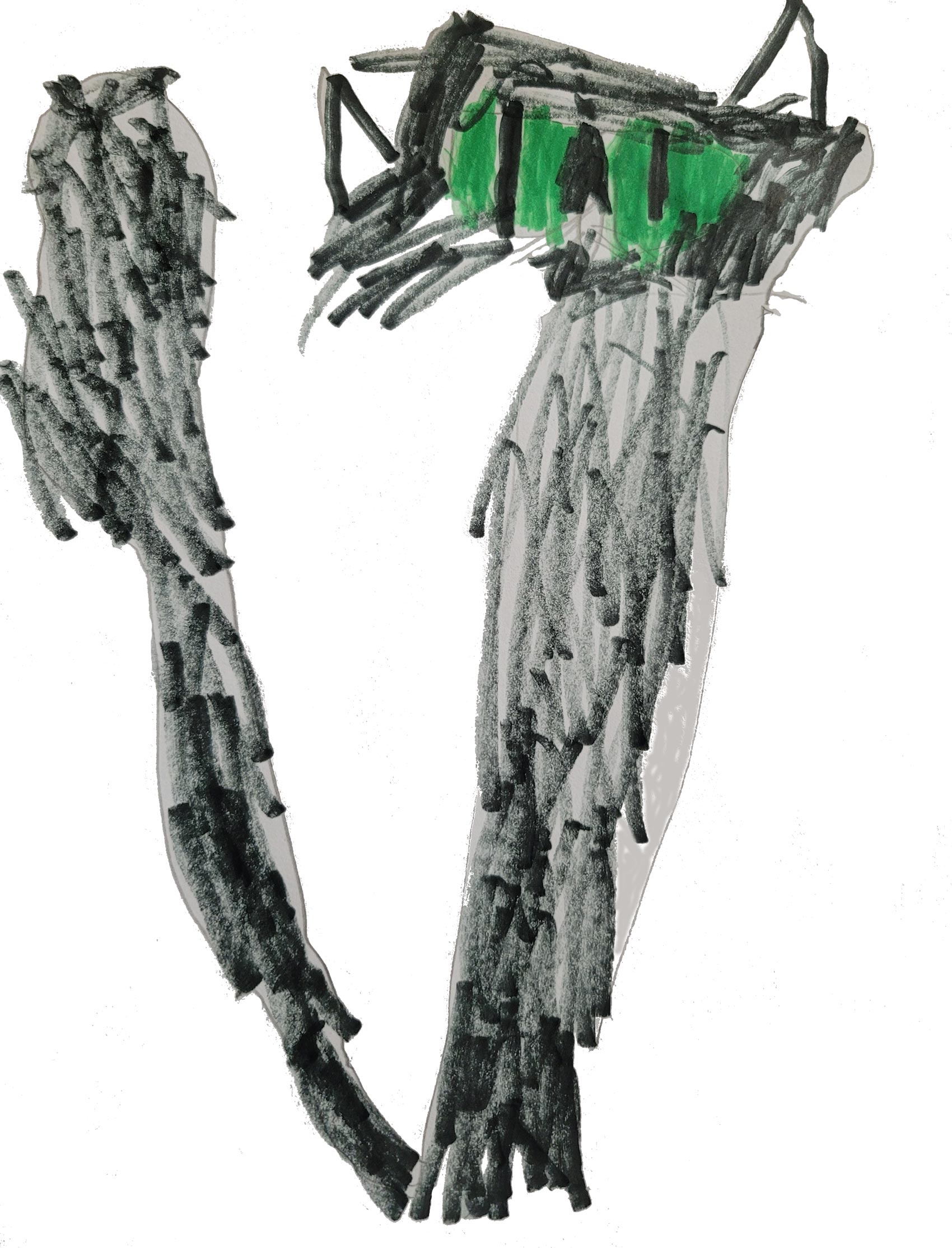 She has very long legs… a small head on top with bright green eyes… and pointy ears.
