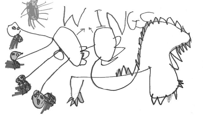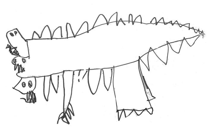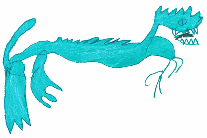 Sasha: "This is my dinosaur, but he's also kinda a dragon. He's SUPER long, like longer than my bed. He’s greenish-blue because that's the best crayon.