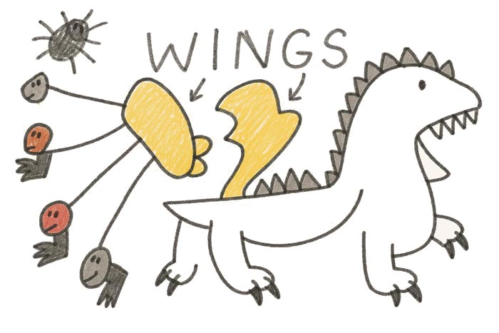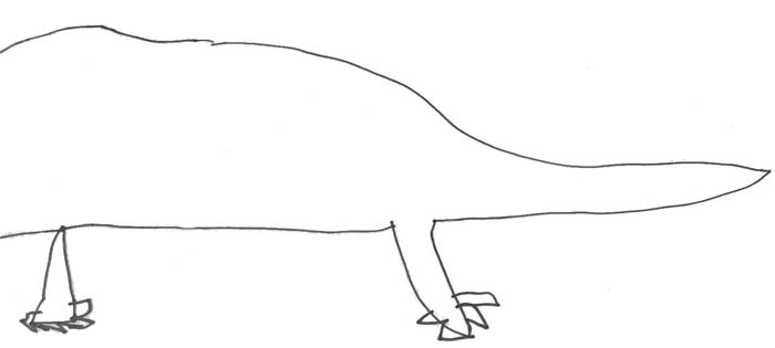 His legs are funny and bendy, and his tail goes whoooosh like this. And he has spikes on his back because that makes him faster.