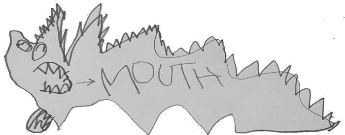 He has sharp teeth because he's saying 'RAAA!'' and he might eat broccoli or bad guys, I don't know. His arms are tiny and wiggly and they don’t help at all.